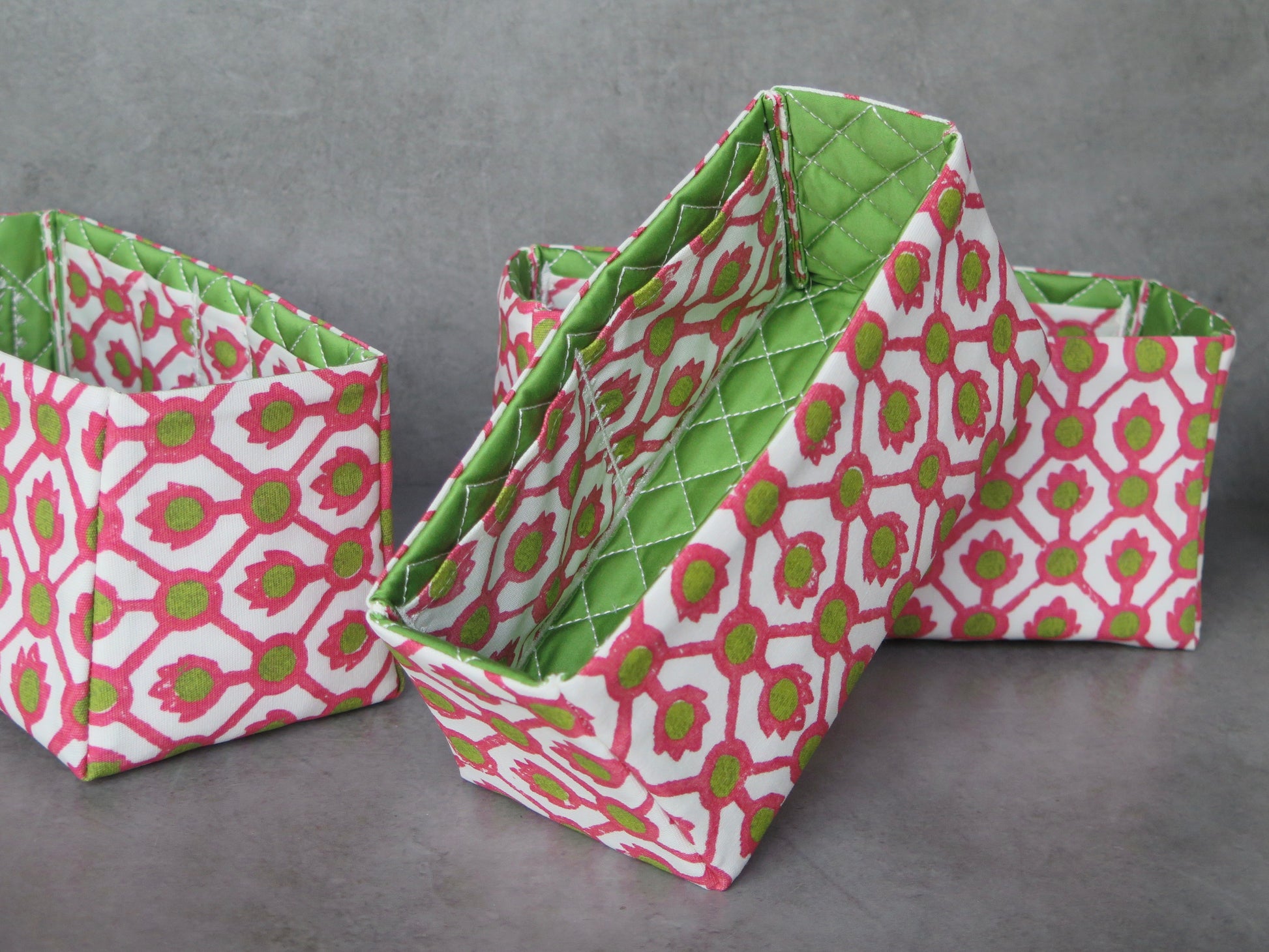 The Trellis design of the insert's exterior and inner pockets is matched with a 100% cotton sateen in bright green for the interior.